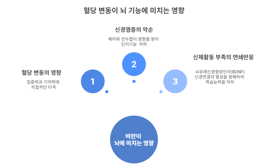 비만 상태에서는 만성적인 염증이 발생하며, 이 염증이 뇌로 전달되어 신경세포의 기능을 저하시킵니다.