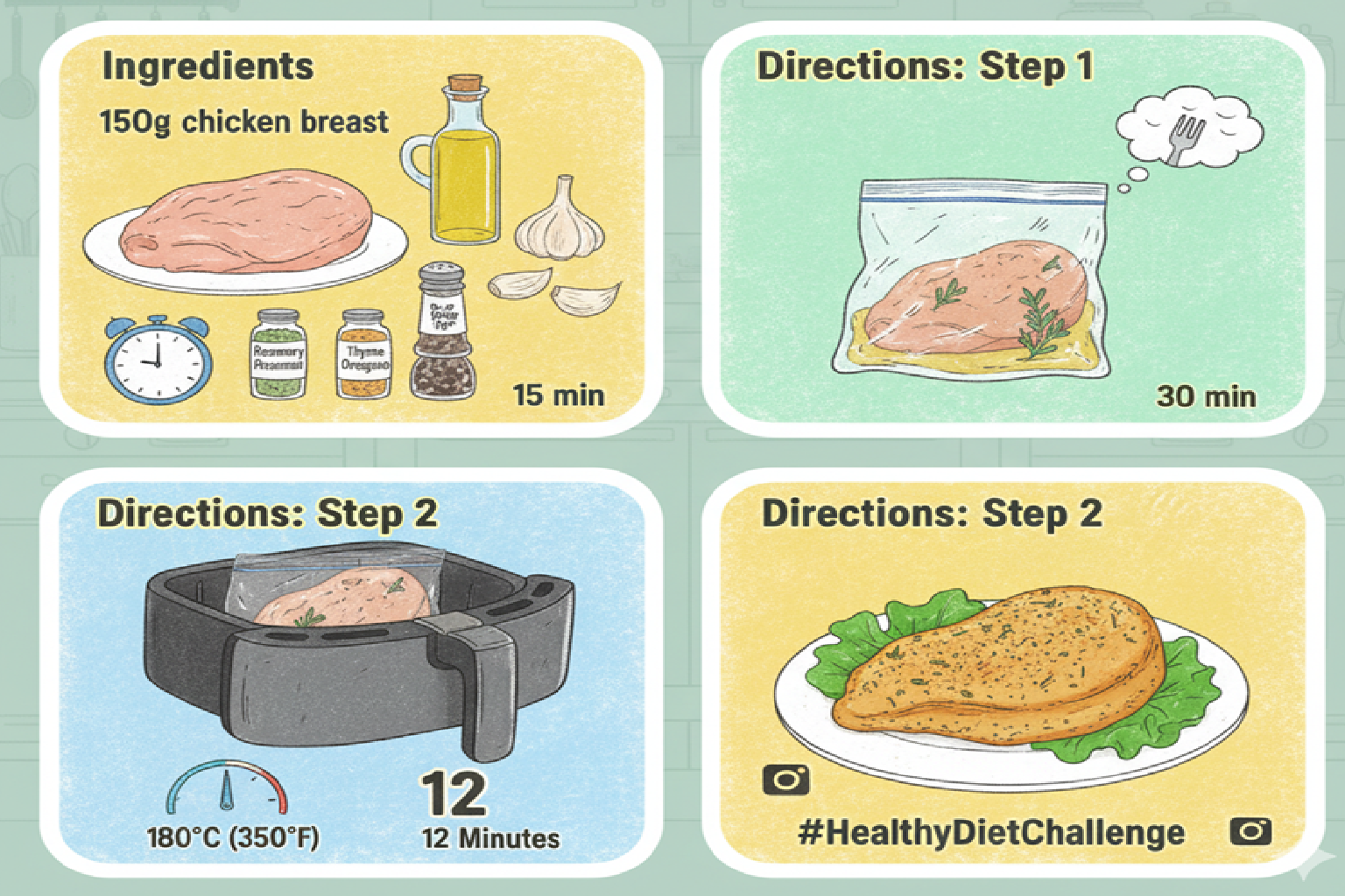 조리법: 닭가슴살을 포크로 찔러 구멍을 낸 후, 모든 재료와 함께 지퍼백에 넣고 30분간 재워주세요. 에어프라이어 180도에서 12분간 조리하면 완성! 소금 없이도 맛있고, 사진 찍기에도 예뻐요. #건강식단챌린지